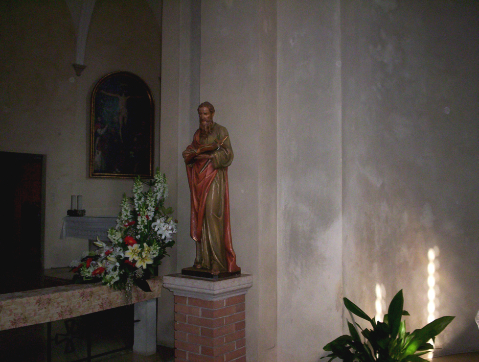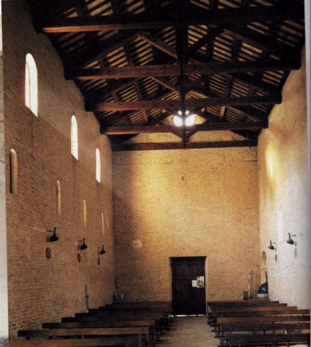 La facciata laterale a nord evidenzia le numerose trasformazioni avvenute nel tempo, ed in particolare ¨ possibile notare il segno della porta che immetteva nel cimitero. L'aspetto del tessuto murario fino a circa 3 metri d'altezza e le maggiori dimensioni dei mattoni impiegati, confermano l'appartenenza dell'impianto dell'edificio al XII secolo. L'interno, semplice e severo, riporta alla memoria le proporzioni dello spazio architettonico antico: essenziale, avaro di luce, solenne e a navata unica. Tale navata si concludeva con tre absidiole, di cui la centrale piu´ ampia, secondo una tipologia architettonica che ricorda modelli antichi ed ¨ presente nell'Italia settentrionale a partire dal VII secolo.
