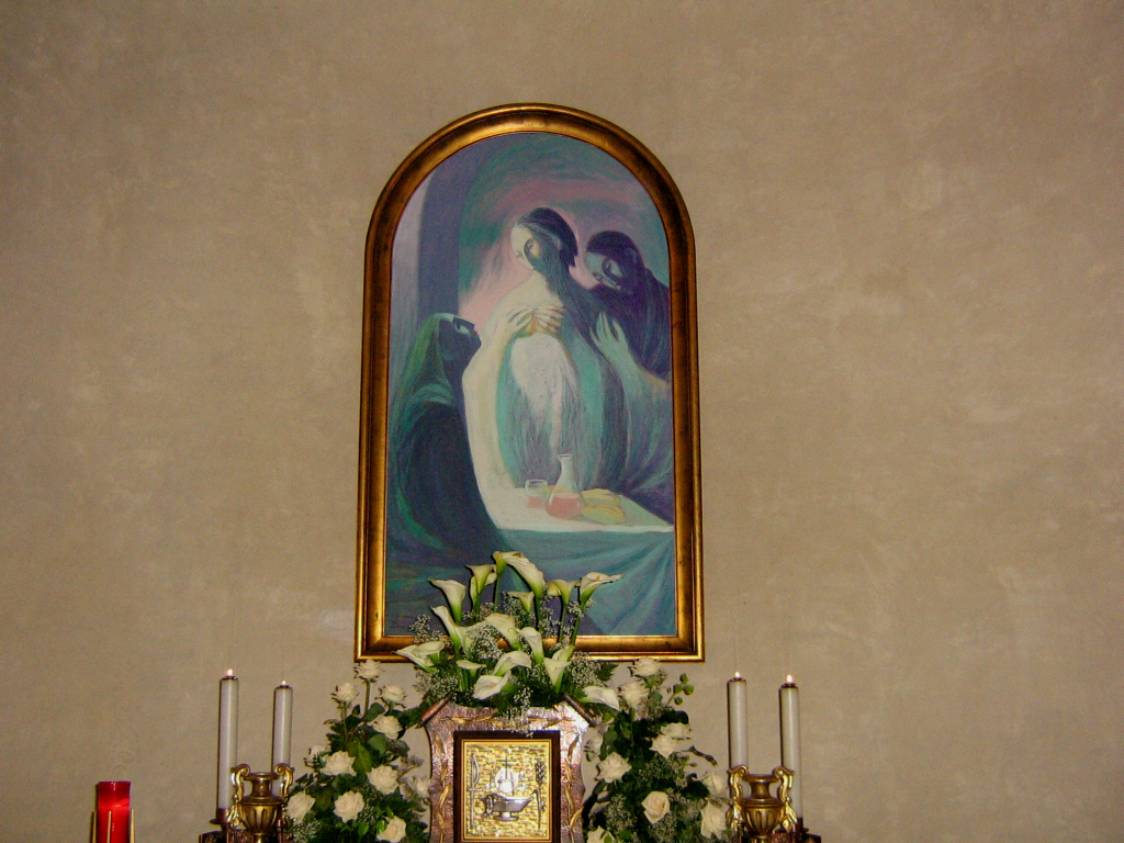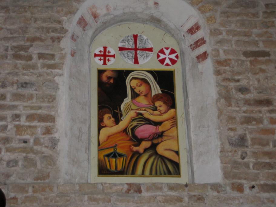 Die Antiken Gemälde bedeckten die ganze Mauer, sind sehr schwer lesbar und enthalten einige Schriften aus der Bibel wahrscheinlich aus dem XII und XIII Jh.Das zweite Gemälde zeigt sich in Quadrat Dekoration mit gerade Linien mit Episoden des Neuen Testaments aus dem XIII und XIV Jh.Das dritte Gemälde, und am besten sehbar und erhaltet, gehört zu der Zeit der Templer und Johanniter, diese ist auch der dritte Dekoration Schicht und die letzt, und stellt den Heiligen Christophorus, die Madonna mit Kind auf den Thron, die Kreuzigung dar, diese gehören zu der Zeit XV und XVI Jh. Im Jahr 1953 wurde die zwei seitliche liegenden Kapelle so wie auch der Chor aus dem XVIII Jh. zerstört um in Erweiterung des Querbaus mit den beiden kupple und Sakristei.Seitlich der Kirche befindet sich noch heute das Pfarrhaus um den XVI XVII Jh. und bewohnt bis 1797 vom Agent des Priorats von Malta. Diese Gebäude wurde errichtet auf die Reste eines grössten zerstörten Gebaüde aus dem XII-XIV Jh. wieder entdeckt in Jahr 1993 durch Ausgrabung von Archeologen.