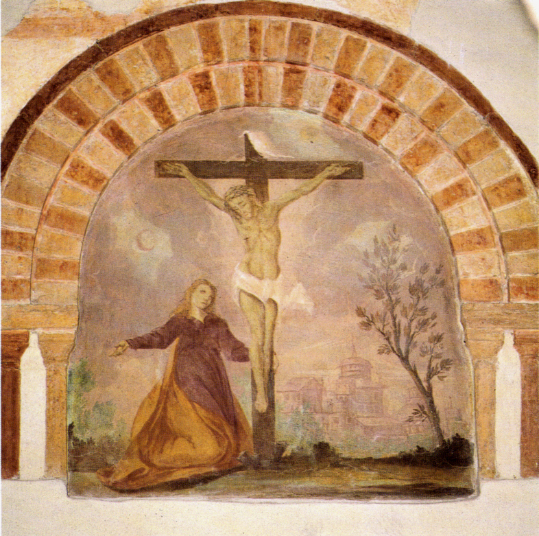 Affresco della Crocifissione. Ai piedi una donna in preghiera.Risalente XIV .