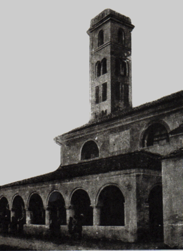 La foto mostra la chiesa nel seicento con sagrestia al portico, le finestre a mezza luna, il campanile con diverso stile. Restauro negli anni `50.
