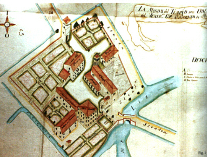 Una pianta della mason di Tempio. La mason recintata da un alto muro all´esterno dal quale corre una strada, il tutto e’ circondato da corsi d` acqua fatti dal Lia. L` ingresso con torre fa assumere immagine di un nucleo ben distinto dal territorio circostante. Il disegno e del XVIII secolo allorchè la mason non aveva piu funzione di riferimento per pellegrini ma solo un ruolo di gestione agricola-economica delle grandi proprietà dei Giovanniti, nei territori di Oderzo, Conegliano e Portobuffol