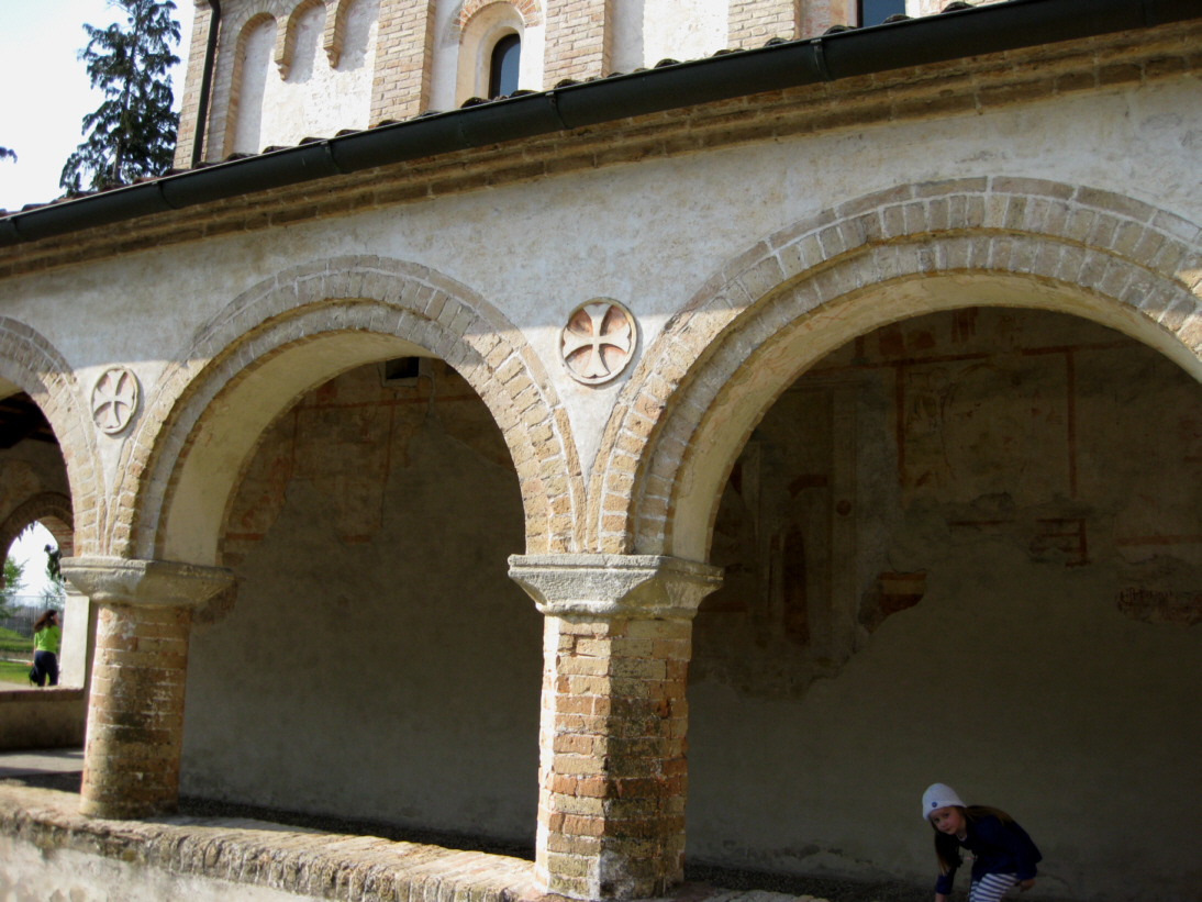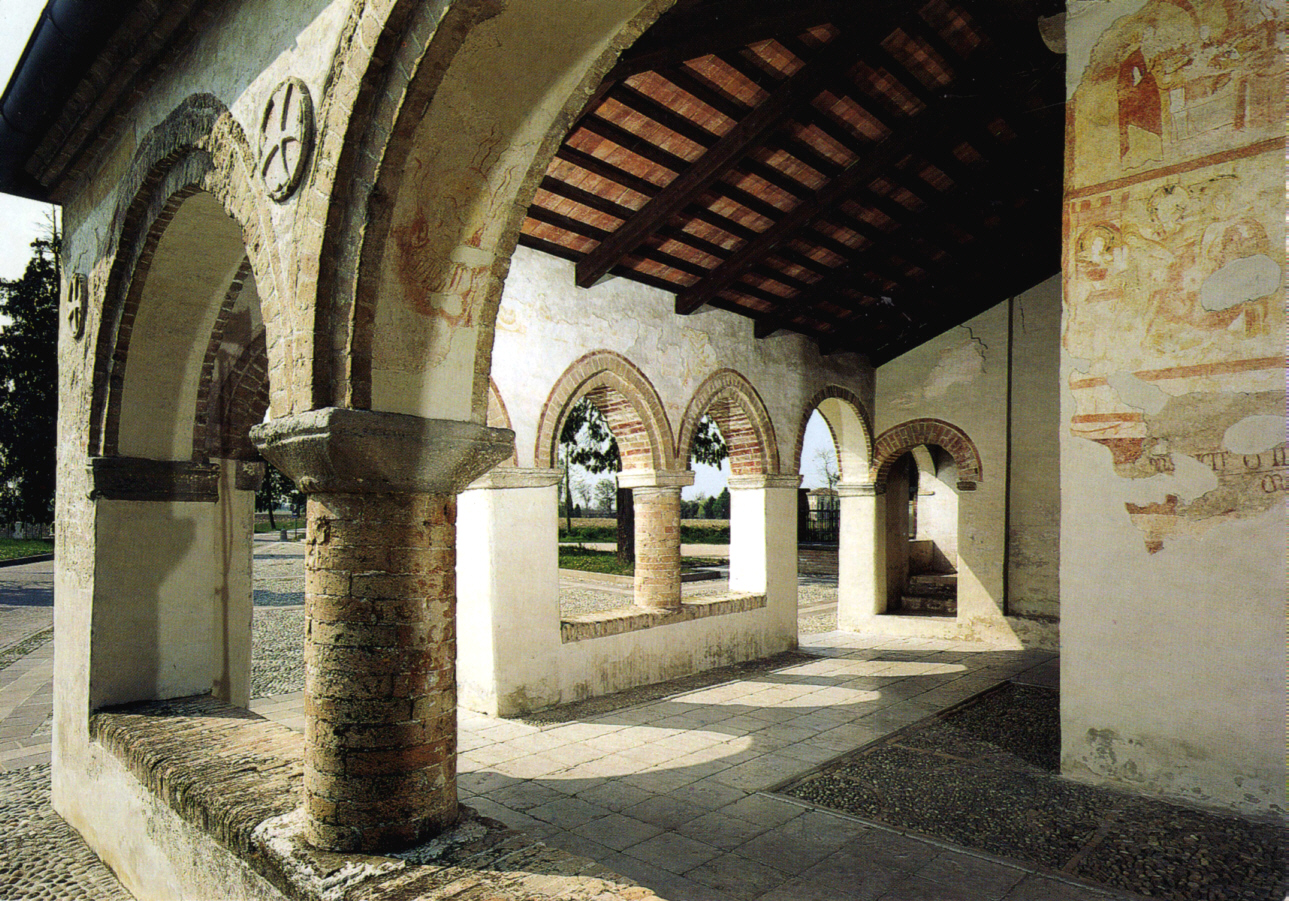 Gli affreschi presenti nel sottoportico risalgono ad almeno 3 distinte fasi esecutive. La prima occupava tutta la superficie muraria e riportava alcune iscrizioni, presumibilmente del XII-XIII secolo .La seconda era costituita da una decorazione di aspetto sinopia le, divisa in riquadri, rappresentanteepisodi delNuovo Testamento databili tra il XIII e il XIV secolo: questi affreschi appartengono alla vera e propria fase templare. Risalgono invece al periodo successivo, e quindi giovannita, le decorazioni del terzo strato rappresentanti San Cristoforo (XIV-XV sec.), la Madonna con Bambino in trono (XVI sec.) e laCrocifissione: quest'ultima realizzata sul tamponamento dell'antica porta laterale d'ingresso alla chiesa.