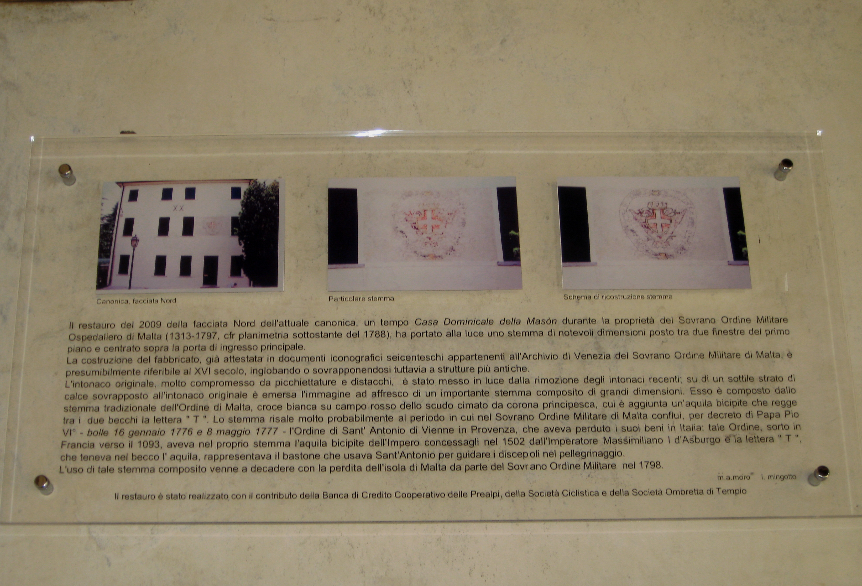 Il restauro del 2009 della canonica, “Casa Dominicale della Mason” sotto il Soprano Militare di Malta ( 1313 - 1789) ha portato alla luce uno stemma di notevole Dimensioni, il quale si trova sul entrata principale di ingresso.